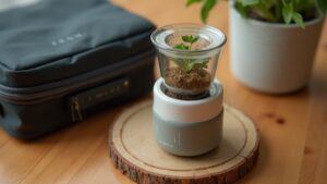 A compact travel-friendly tea maker designed for loose leaf tea, with a built-in infuser and modern design.
